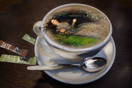 If Ophelia had decided to drown her sorrows in a cup of coffee (rather than drowning herself), then perhaps Hamlet would have said “Espresso or double espresso, that is the question”! Our artwork is a coffee-themed tribute to “Ophelia” by Millais, held in the Tate. We wanted to make this our own, so Debi Belladonna modelled for the picture of Ophelia. Instead of holding flowers, our Ophelia symbolically holds a spoon and a large sugar lump. This is the product of an artistic collaboration between two friends involving painting, photography, collage, Photoshop, creative differences, and numerous cups of coffee.